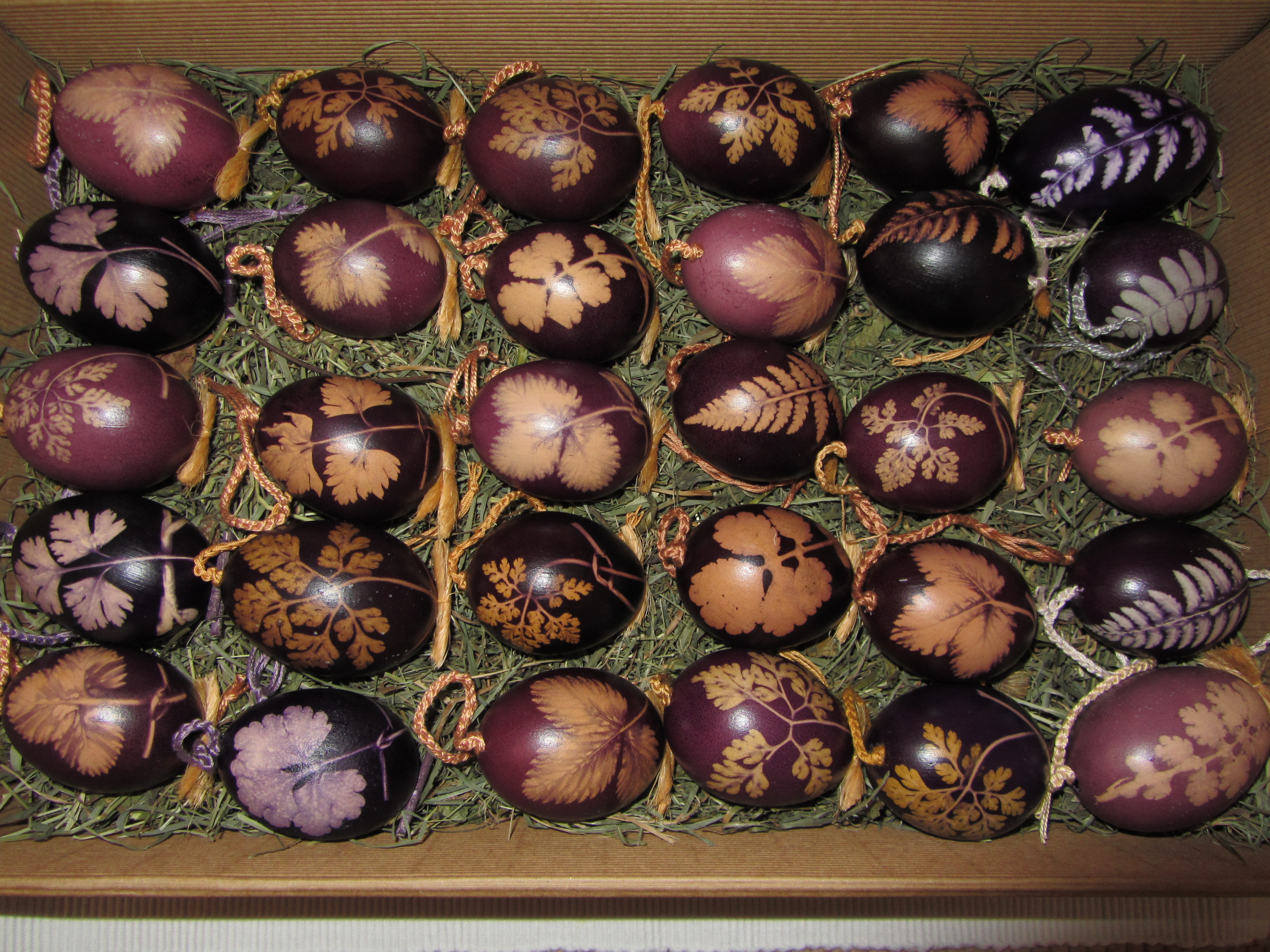 Sämtliche Eier werden von mir einzeln mit Motiven versehen und ausschließlich unter Verwendung natürlicher Farbgewinnung gefärbt: