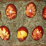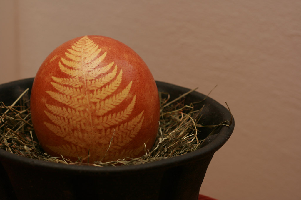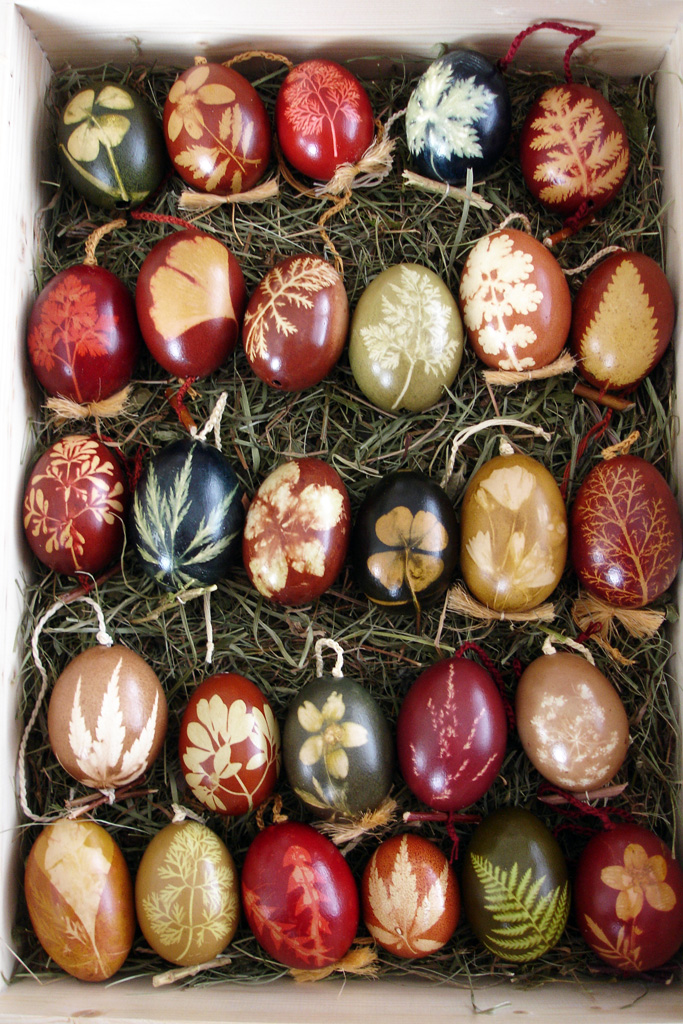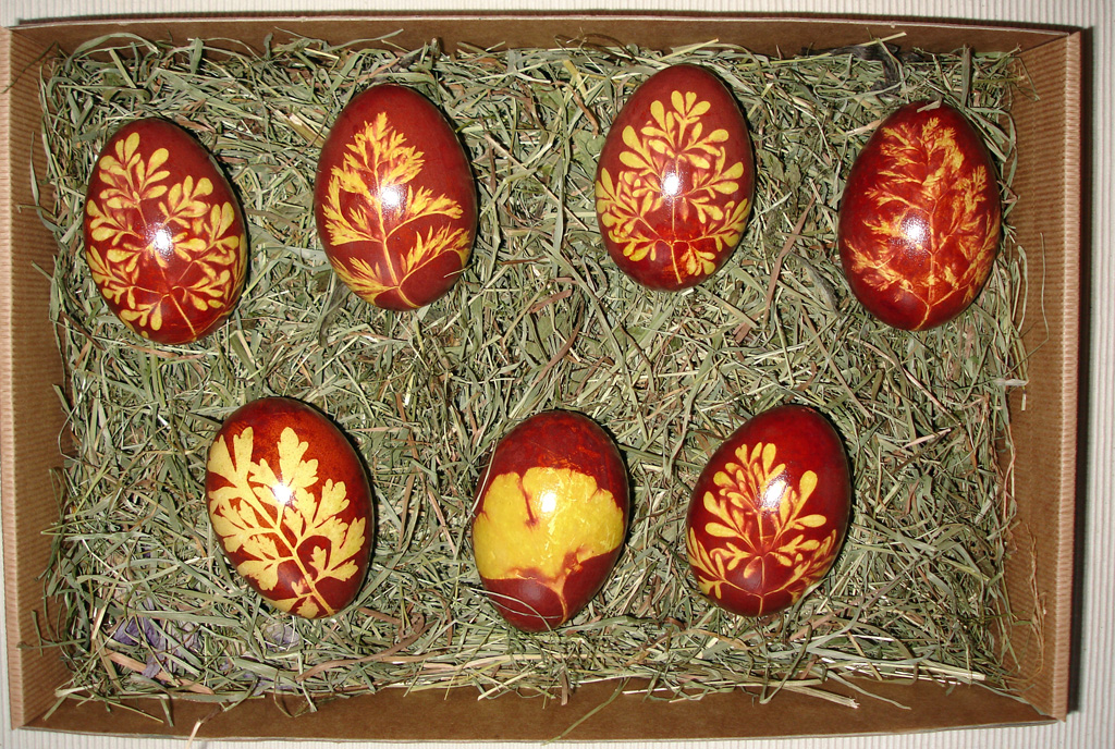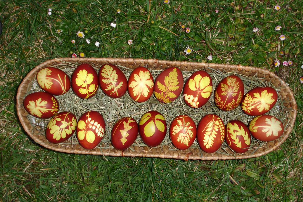 Sämtliche Eier werden von mir einzeln mit Motiven versehen und ausschließlich unter Verwendung natürlicher Farbgewinnung gefärbt: